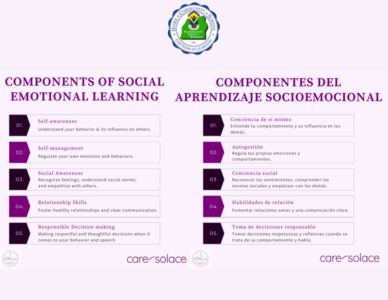 Cuando su estudiante sea capaz de reconocer emociones difíciles y desee ayuda para encontrar un proveedor de atención de salud mental para él, use Care Solace, un servicio gratuito y confidencial de coordinación de atención proporcionado por Washington County Schools: